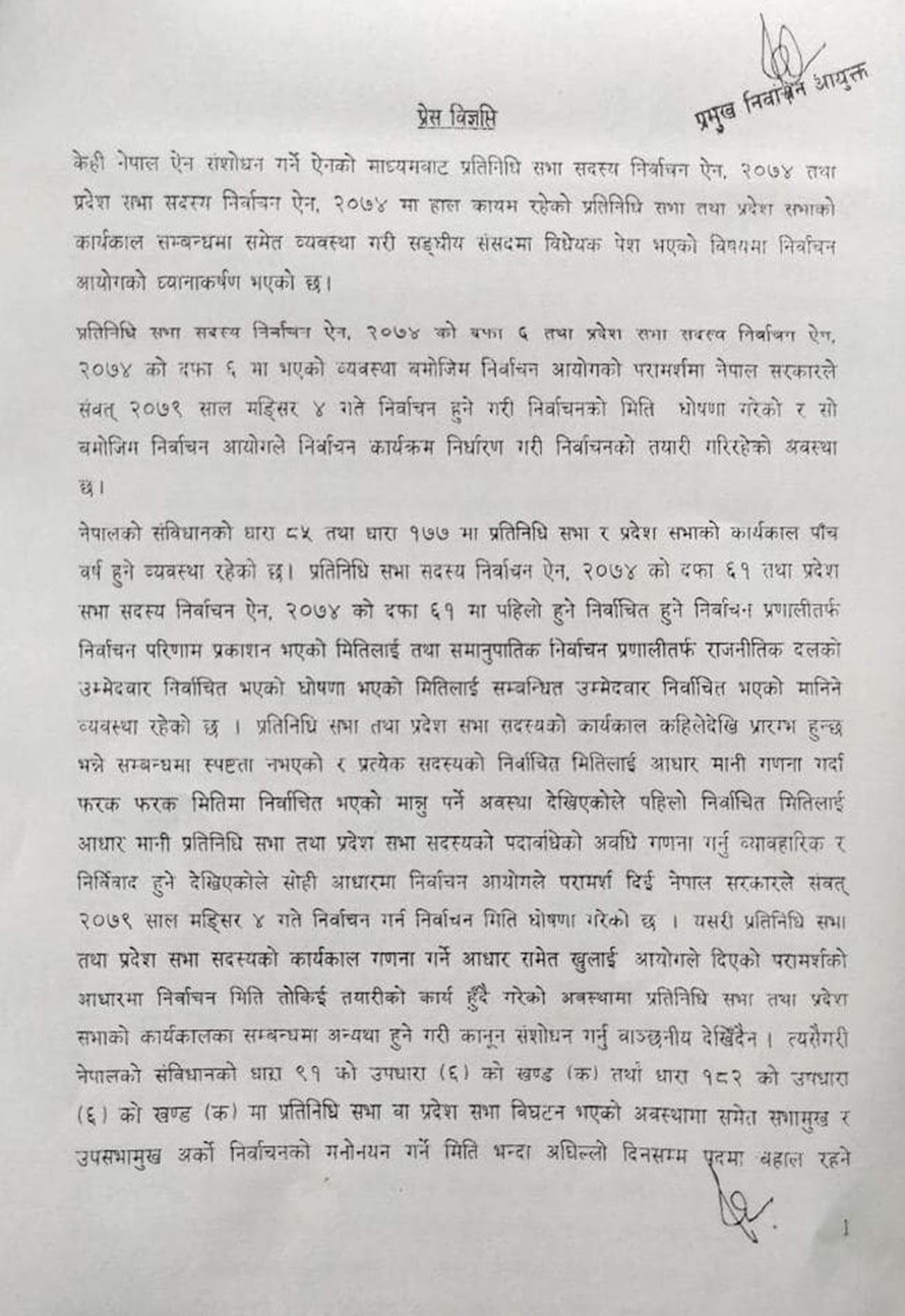 निर्वाचन आयोगका प्रमुख निर्वाचन आयुक्तले आइतबार संघीय संसद सचिवालयमा पठाएको पत्रमा हालको प्रतिनिधिसभाको असोज १ गतेसम्म मात्रै कायम रहने व्याख्यात्मक व्यहोरा उल्लेख छ । ‘नेपालको संविधानको धारा ९१ को उपधारा (६) को खण्ड (क) तथा धारा १८२ को उपधारा (६) को खण्ड (क) मा प्रतिनिधिसभा वा प्रदेशसभा विघटन भएको अवस्थामा समेत सभामुख र उपसभामुख अर्को निर्वाचनको मनोनयन गर्ने मितिभन्दा अघिल्लो दिनसम्म पदमा बहाल रहने व्यवस्था गरेबाट निर्वाचनको लागि उम्मेदवार मनोनयन हुने दिनदेखि नै सभामुख तथा उपसभामुख पदमा नरहने संवैधानिक व्यवस्था भएको सन्दर्भमा प्रतिनिधिसभा वा प्रदेश सभाका अन्य सदस्यहरु सोही पदको लागि हुने निर्वाचनका लागि मनोनयनपत्र पेश गर्ने मिति पछिसम्म कायम रहने गरी कानून संशोधन गर्नु उपयुक्त देखिँदैन’ केही नेपाल ऐन संशोधन विधेयकमाथि टिप्पणी गर्दै आयोगले भनेको छ ।