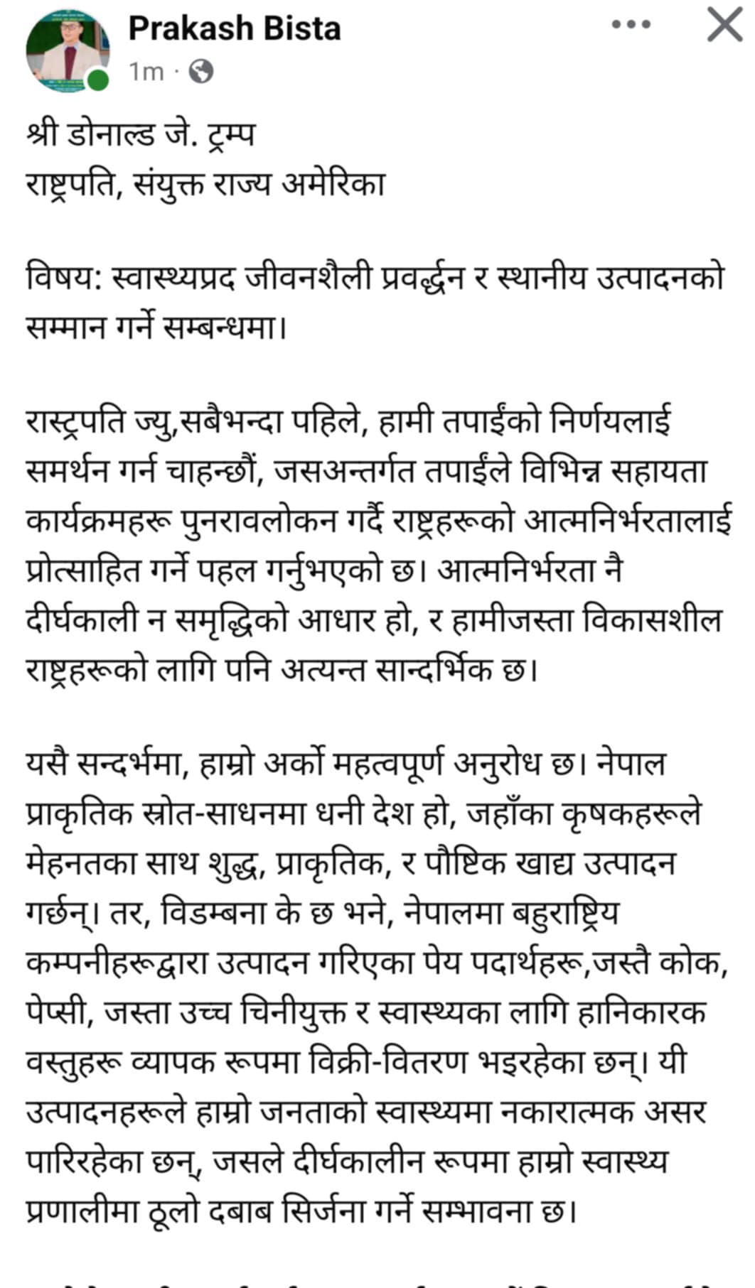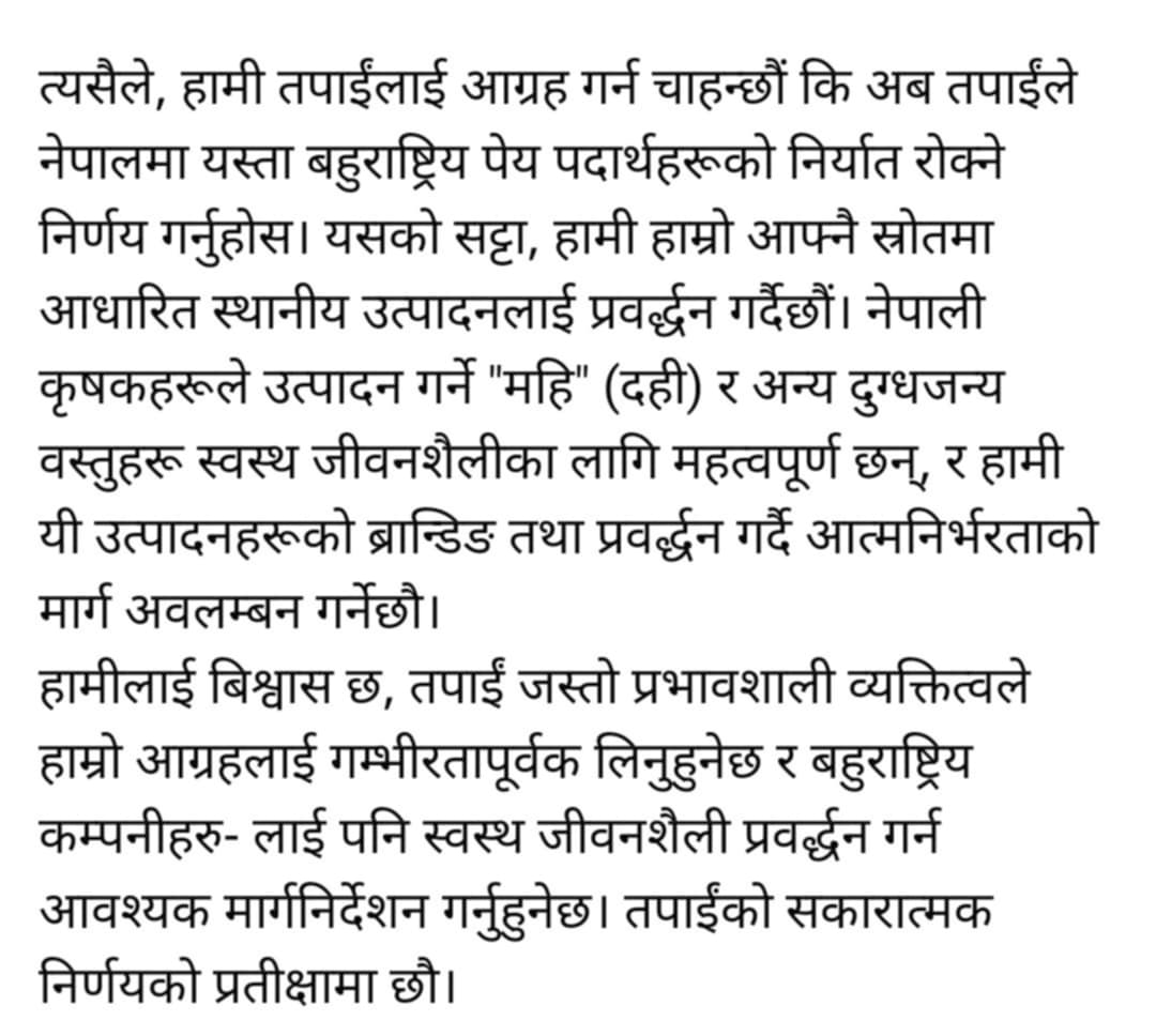 उनले लेखेका छन् “उच्च चिनीयुक्त यस्ता पेय पदार्थहरूले हाम्रो जनताको स्वास्थ्यमा दीर्घकालीन असर पार्ने सम्भावना छ, जसले हाम्रो स्वास्थ्य प्रणालीमा ठूलो दबाब सिर्जना गर्नेछ।” पत्रमा विष्टले अमेरिकी प्रशासनलाई नेपालमा यस्ता पेय पदार्थहरूको निर्यात रोक्न आग्रह गरेका छन् । साथै, नेपालमा स्थानीय स्रोतमा आधारित उत्पादनहरू, जस्तै महि (दही) र अन्य दुग्धजन्य वस्तुहरूलाई प्रवर्द्धन गर्दै आत्मनिर्भरताको मार्ग अपनाउने योजनाबारे पनि जानकारी गराएका छन्।