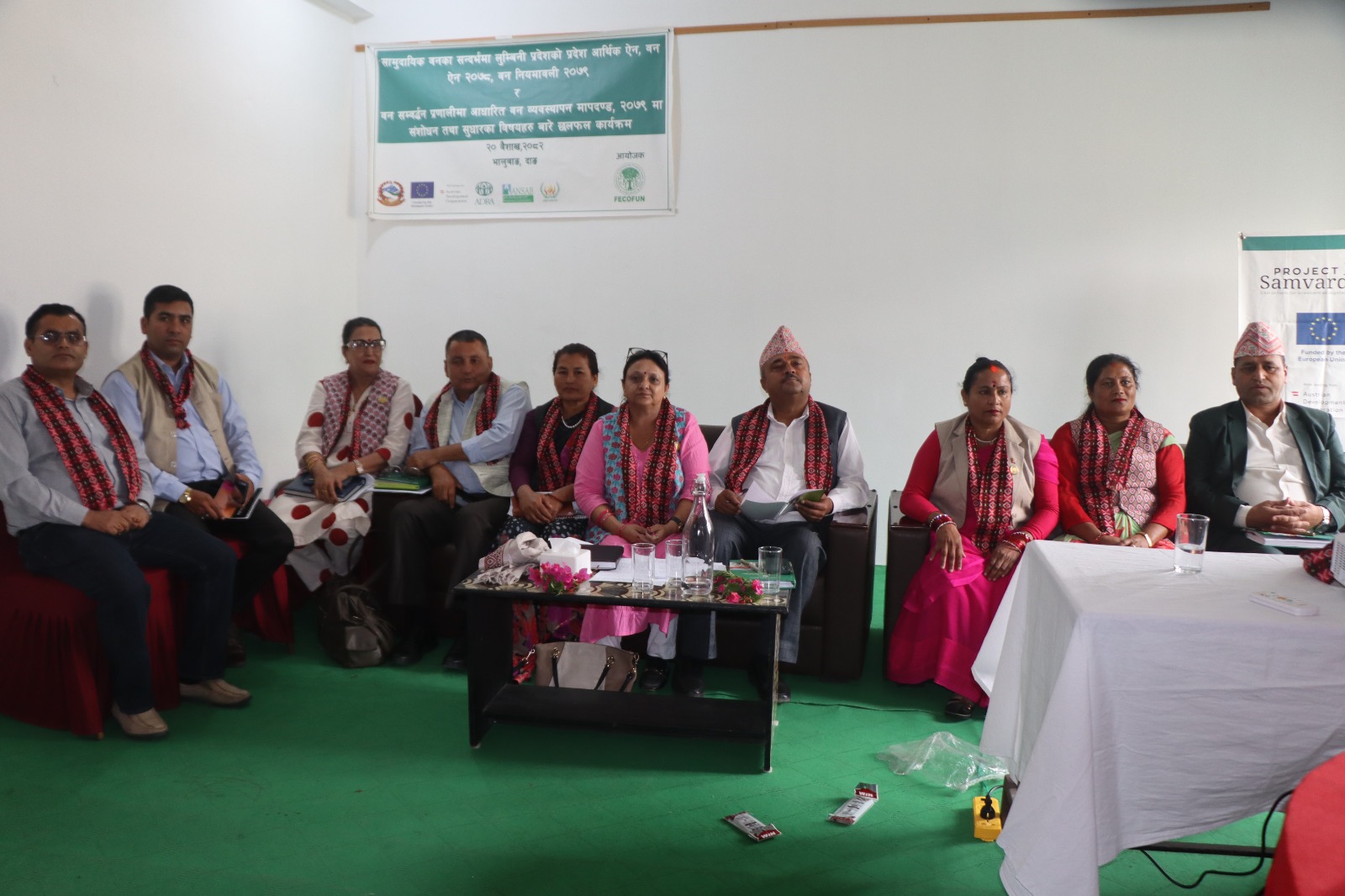 साे अवसरमा सामुदायिक वन महासंघका बरिष्ठ कानुन अधिकृत डिलराज खनालले वन ऐन २०७९ काे संसाेधन,तेह्राे कर प्रणाली, संघ, प्रदेश र स्थानीय तहमा बाँझिएका कानुनीहरू र वन सम्वद्धन प्रणाली लगायतका बिषयमा प्रस्तुतिकरण गर्नु भएकाे थियाे । कार्यक्रमकाे सञ्चालन सामुदायिक वन महासंघ लुम्बिनीका महासचिव शाेभाकर सापकाेटाले गर्नु भएकाे थियाे ।