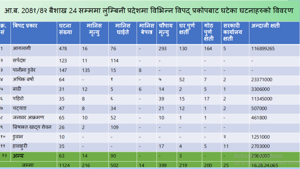 लुम्बिनी प्रदेशमा बितेको १० महिनामा ११ सय २४ वटा विपद्का घटना, २ सय १६ जनाको मृत्यु