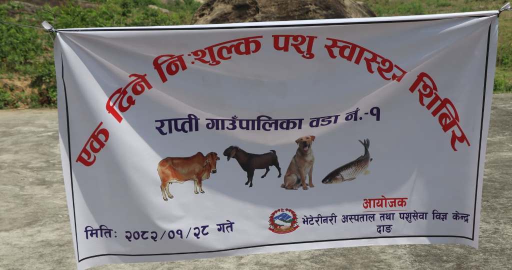 भालुवाङ २८ बैशाख । दाङ–देउखुरीको राप्ती गाउँपालिका–१, भालुवाङ र शान्तिपुर चैतेमा आज आईतबार एक दिने निशुल्क पशु स्वास्थ्य शिविर सम्पन्न भएको छ । भेटेरीनरी अस्पताल तथा पशु सेवा विज्ञ केन्द्र दाङको आयोजनामा निशुल्क पशु स्वास्थ्य शिविर सम्पन्न भएको हो ।
