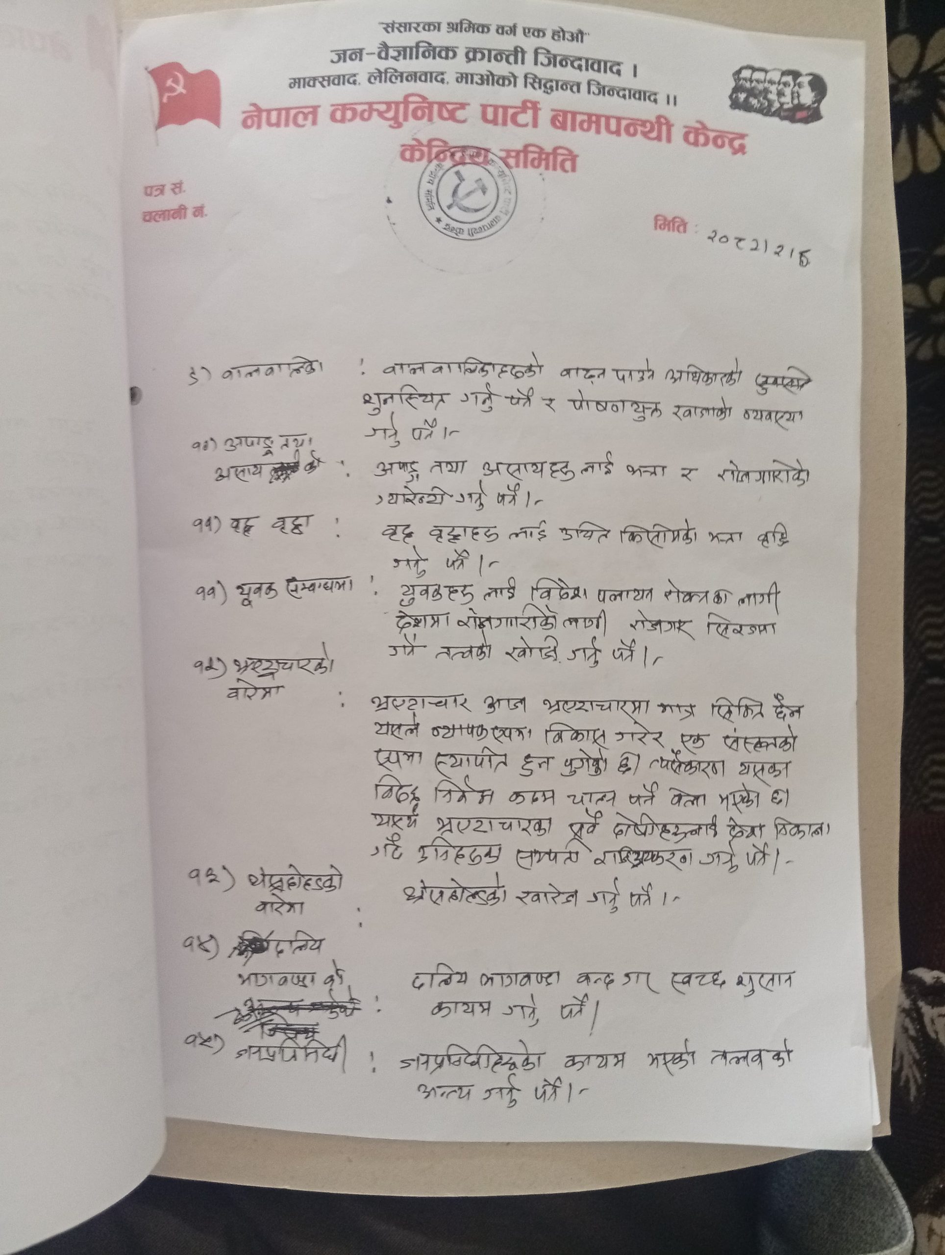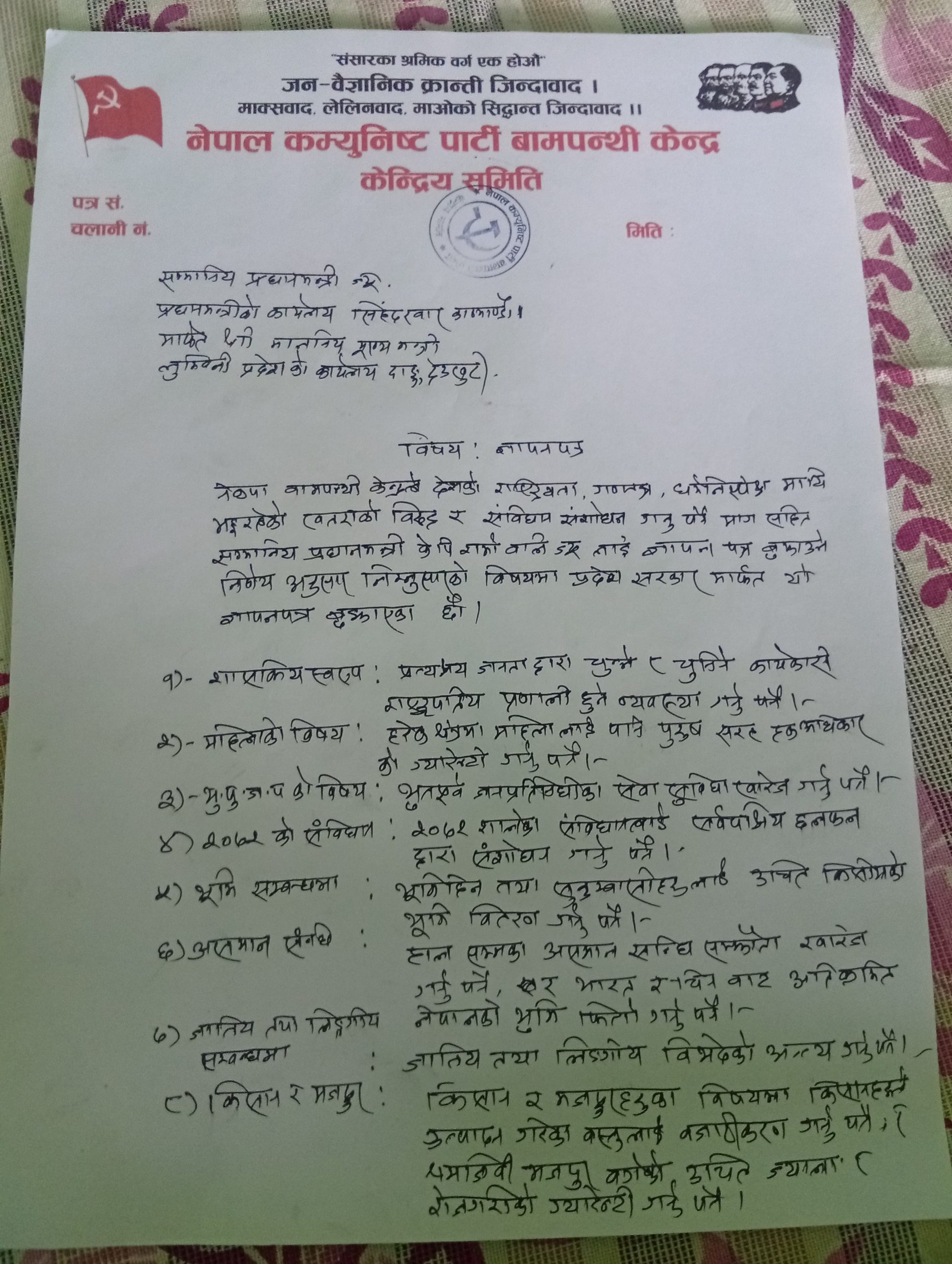 नेकपा बामपन्थीले मुख्यमन्त्री आचार्य मार्फत प्रधानमन्त्री ओलीलाई बुझायो १९ बुँदे माग सहितको ज्ञापनपत्र