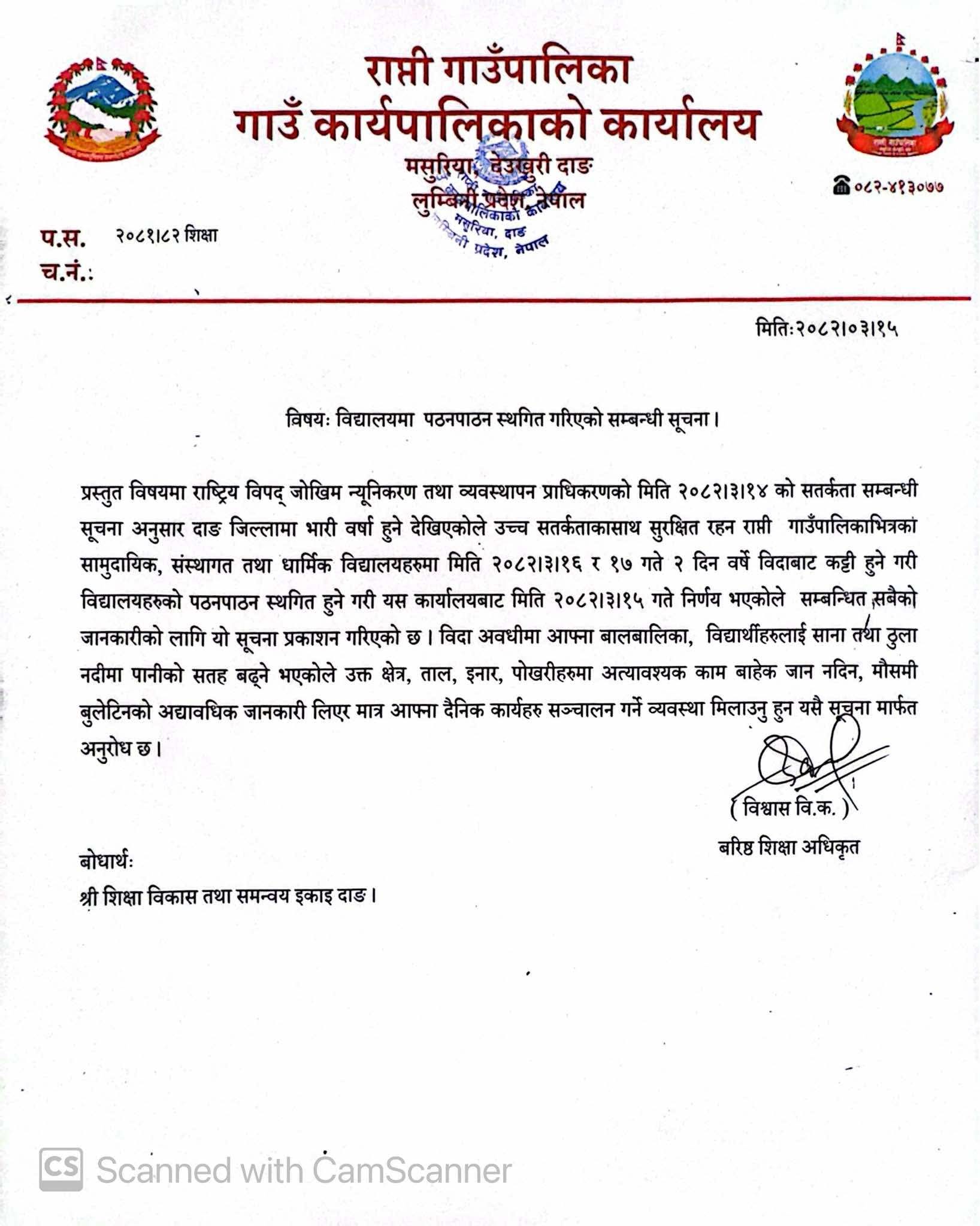 राप्ती गाउँपालिकाको शिक्षा शाखाले आइतबार जारी गरेको सूचनामा असार १४ गते राष्ट्रिय विपद् जोखिम न्यूनीकरण तथा व्यवस्थापन प्राधिकरणले जारी गरेको सतर्कता सम्बन्धी सूचनाका आधारमा यस्तो निर्णय गरिएको उल्लेख गरिएको छ। उक्त बिदा वर्षे बिदाबाट कट्टी हुने पनि सूचनामा स्पष्ट गरिएको छ। शिक्षा शाखाका अनुसार केही दिनदेखि लगातार परेको भारी वर्षाका कारण नदी, खोला, इनार, पोखरी, जमिन भासिन र पहिरो जाने सम्भावना उच्च रहेकोले विशेष सतर्कता अपनाउन आग्रह गरिएको छ। साथै, बिदाको समयलाई बालबालिकालाई दैवीप्रकोपसम्बन्धी सचेतना दिने अवसरको रूपमा प्रयोग गर्न शिक्षक, अभिभावक र विद्यालय प्रशासनलाई अनुरोध गरिएको छ।