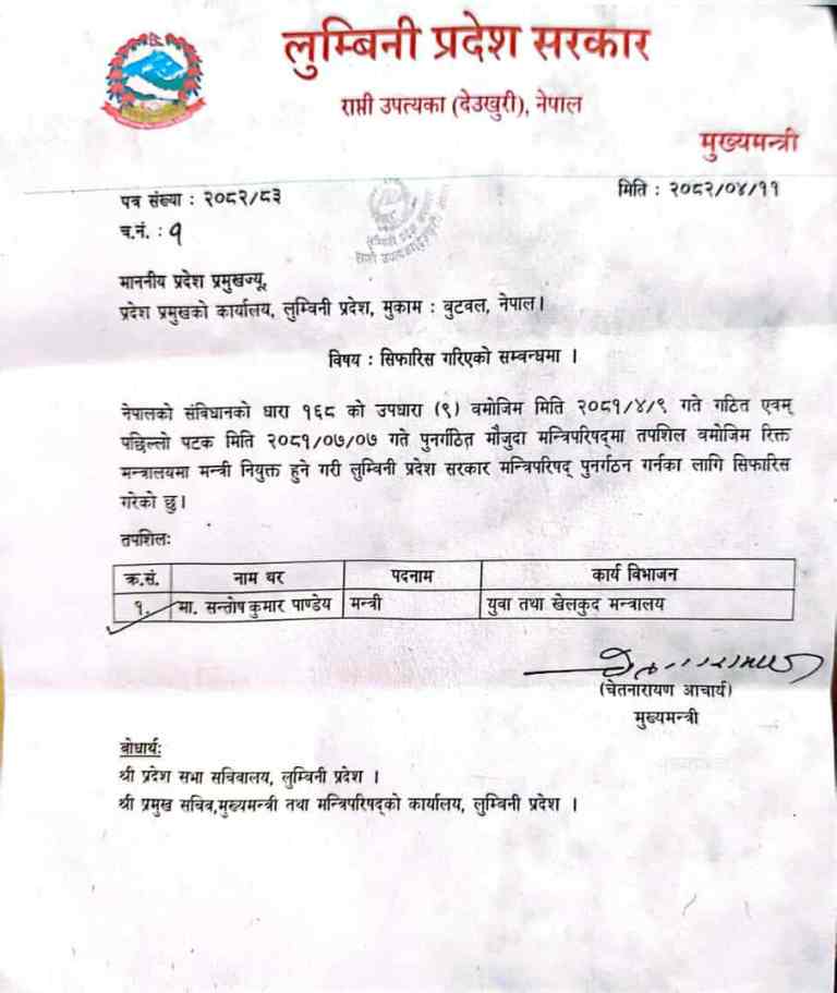 दाङ ११ साउन । लुम्बिनी प्रदेशमा लोकतान्त्रिक समाजवादी पार्टीका सांसद सन्तोषकुमार पाण्डेय मन्त्री नियुक्त भएका छन् । उनलाई मुख्यमन्त्री चेतनारायण आचार्यले युवा तथा खेलकुद मन्त्री नियुक्त गरेका हुन् ।