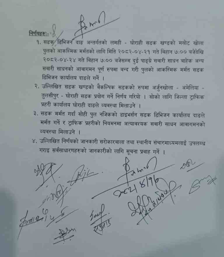 निर्णयअनुसार यहि साउन २१ गते बिहान ७ बजेदेखि २४ गते बिहान ७ बजेसम्म मसोट खोला पुलमा दुई पाङ्ग्रे बाहेकका अन्य सबै प्रकारका सवारी साधनको आवागमन पूर्ण रूपमा रोकिनेछ । उक्त अवधिमा सडक डिभिजन कार्यालय दाङले पुलको आकस्मिक मर्मत गर्नेछ । पुल मर्मत भइरहँदा यात्रु तथा सवारी चालकलाई वैकल्पिक मार्गको रूपमा अर्जुनखोला–अमेलिया–तुलसीपुर–घोराही सडक प्रयोग गर्न जिल्ला ट्राफिक प्रहरी कार्यालय घोराहीले आग्रह गरेको छ ।
