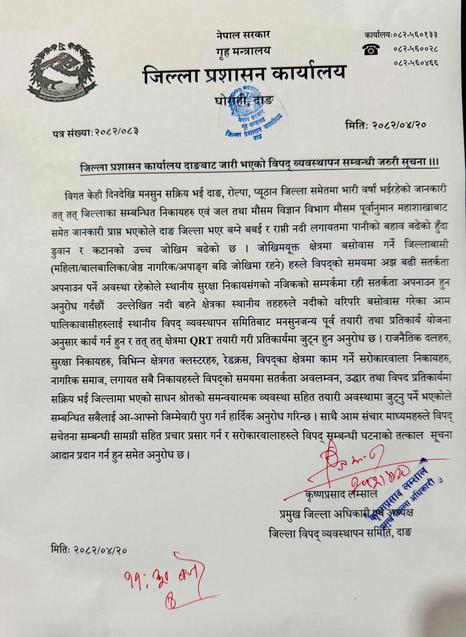 साथै, राजनीतिक दल, सुरक्षा निकाय, रेडक्रस, नागरिक समाज, विपद् सम्बन्धी काम गर्ने क्लस्टर तथा अन्य सरोकारवाला निकायहरुलाई समन्वयात्मक रूपमा सक्रिय रहन आग्रह गरिएको छ । विपद्को जोखिम न्यूनीकरण तथा तत्कालीन उद्धारमा संलग्न हुन सबैलाई आ-आफ्नो जिम्मेवारी निर्वाह गर्न प्रमुख जिल्ला अधिकारी कृष्णप्रसाद लम्सालले आग्रह गरेका छन् ।