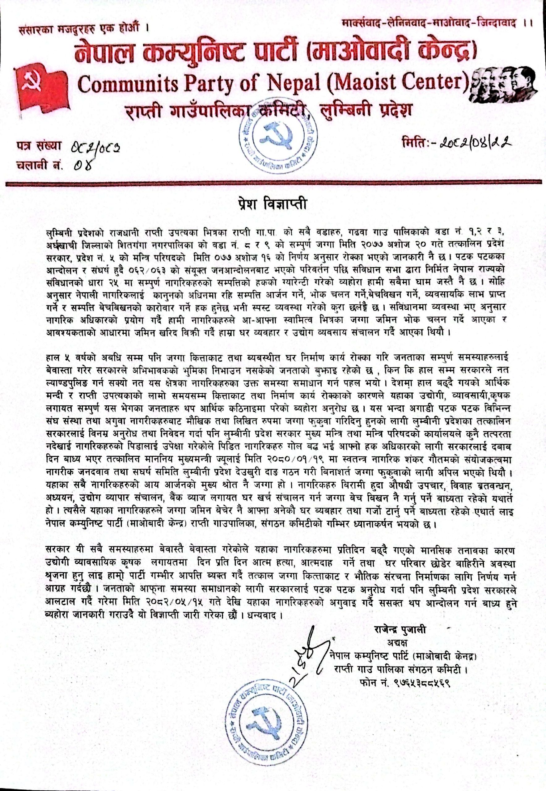 पार्टीले जग्गा रोक्काले नागरिकहरूको आय–आर्जनमा प्रत्यक्ष असर परेको उल्लेख गर्दै,उपचार, विवाह–व्रतबन्ध, अध्ययन, व्यापार–व्यवसाय, बैंक कर्जा भुक्तानी र घरखर्च समेत चलाउन समस्या भएको तर्फ ध्यानाकर्षण गराएको छ। नागरिकहरूले समस्या पर्दा जग्गा बेचेर भएपनि आवश्यकताहरू पूरा गर्दै आएको उल्लेख गर्दै, यथाशीघ्र कित्ताकाट खुलाउन माग गरिएको हो। सरकारले जनताको समस्याप्रति बेवास्ता गरेकाले नागरिकहरूमा मानसिक तनाव चुलिँदो छ, जसका कारण उद्योगी, कृषक, व्यवसायीहरू आत्महत्या, आत्मदाहजस्ता अत्यन्त गम्भीर निर्णयमा पुग्ने अवस्था सिर्जना हुन थालेकोप्रति पार्टीले गम्भीर आपत्ति जनाएको छ। लुम्बिनी प्रदेश सरकारद्वारा २०७७ साल असोज १६ गते मन्त्री परिषदको निर्णय अनुसार राप्ती उपत्यका भित्रको सम्पूर्ण जग्गा रोक्का गरिएको थियो। यसमा राप्ती गाउँपालिकाका ९ वटै वडाहरू, गढवा गाउँपालिकाको वडा नं. १, २, ३ तथा अर्घाखाँचीको शितगंगा नगरपालिका वडा नं. ८ र ९ को सम्पूर्ण जग्गा परेका छन्।