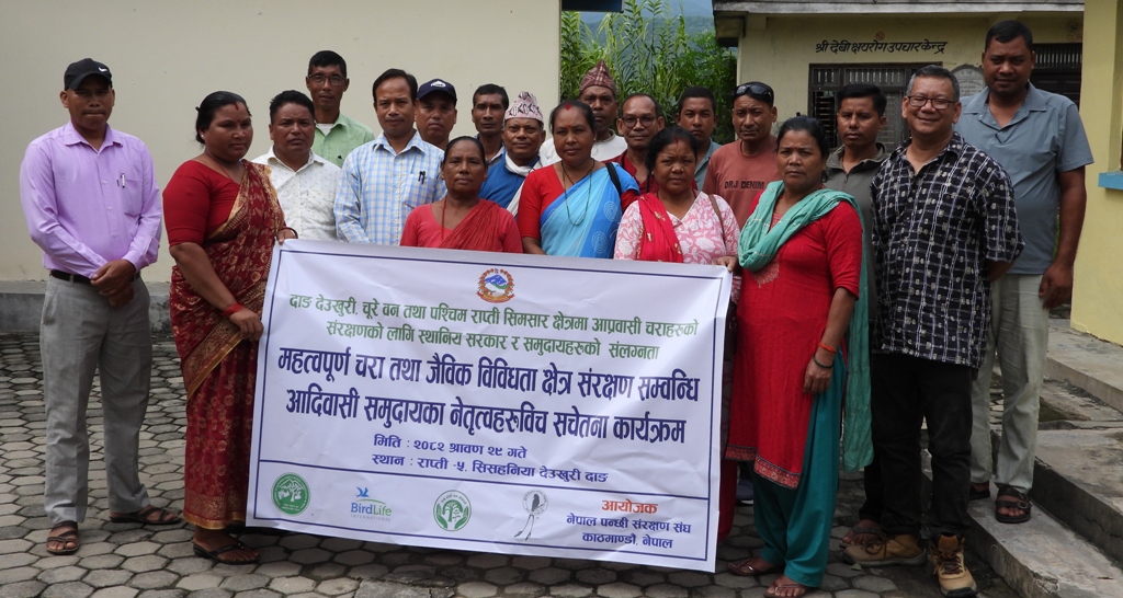 देउखुरी ३० साउन । दाङ-देउखुरीकाे राप्ती गाउँपालिका-५, का स्थानीय आदाबासी समुदायहरू संग आप्रबासी चरा संरक्षण परियाेजनाकाे बिषयमा स्थानीय आदिबासीहरू संग छलफल गरिएकाे छ । नेपाल पंक्षी संरक्षण संघले सञ्चालन गर्न थालेकाे दाङ-देउखुरी चूरे वन तथा पश्चिम राप्ती सिमसार क्षेत्रमा आप्रवासी चराहरुको संरक्षणको लागि स्थानिय सरकार र समुदायहरुको संलग्नता नामक परियोजना अन्तर्गत राप्ती गाँउपालिका वडा नं. ५ सिंसहनियाँका आदीबासी समुदायका नेतृत्वहरु वीच महत्वपूर्ण चरा तथा जैविक विविधता क्षेत्र संरक्षण सम्बन्धि संचेतना कार्यक्रम बिहिबार देउखुरीकाे सिसहनियाँमा सम्पन्न भएकाे हाे ।