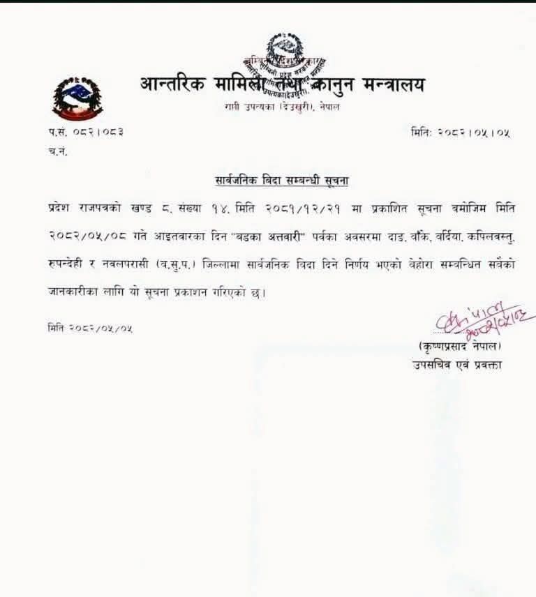 थारु समुदायको बसोजास बढी रहेको दाङ, बाँके, बर्दिया, कपिलवस्तु, रूपन्देही र पश्चिम नवलपरासीमा सार्वजनिक बिदा दिने सूचना आन्तरिक मामिला तथा कानुन मन्त्रालयले सार्वजनिक गरेको छ । थारू समुदायमा महत्वका साथ मनाइने बर्का अट्वारी पर्व यस बर्ष भदौ ८ गते आइतबार परेको छ।