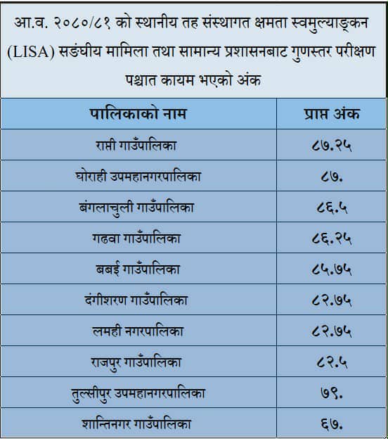 आठौं स्थानमा राजपुर गाउँपालिका ८२.५० प्रतिशत, नवौं स्थानमा तुलसीपुर उपमहानगरपालिका ७९ प्रतिशत र दशौं स्थानमा शान्तिनगर गाउँपालिका ६७ प्रतिशत अंकसहित परेका छन्। स्थानीय तह संस्थागत क्षमता स्वमूल्याङ्कनमा १० सूचक र एक सय प्रश्नहरू राखिएका छन्। ती सूचकमा ९ देखि १६ अंकसम्मको पूर्णाङ्क तोकिएको हुन्छ। नेपालको संविधान, स्थानीय सरकार सञ्चालन ऐन २०७४, अन्त सरकारी वित्त व्यवस्थापन ऐन २०७४ लगायतका कानुनले तोकेका कार्य, जिम्मेवारी र उपलब्धिका आधारमा स्थानीय तहले स्वमूल्याङ्कन गर्ने व्यवस्था गरिएको छ। त्यस्तै स्थानीय तहको सबल र दुर्बल पक्षको पहिचान गर्ने उद्देश्यले तयार गरिएको स्वमूल्याङ्कन कार्यविधि २०७७ अनुसार सो नतिजा कार्यपालिकाबाट स्वीकृत गरी आ–आफ्नो वेबसाइट र सूचना पाटीमार्फत सार्वजनिक गर्नुपर्ने उल्लेख गरिएको छ।