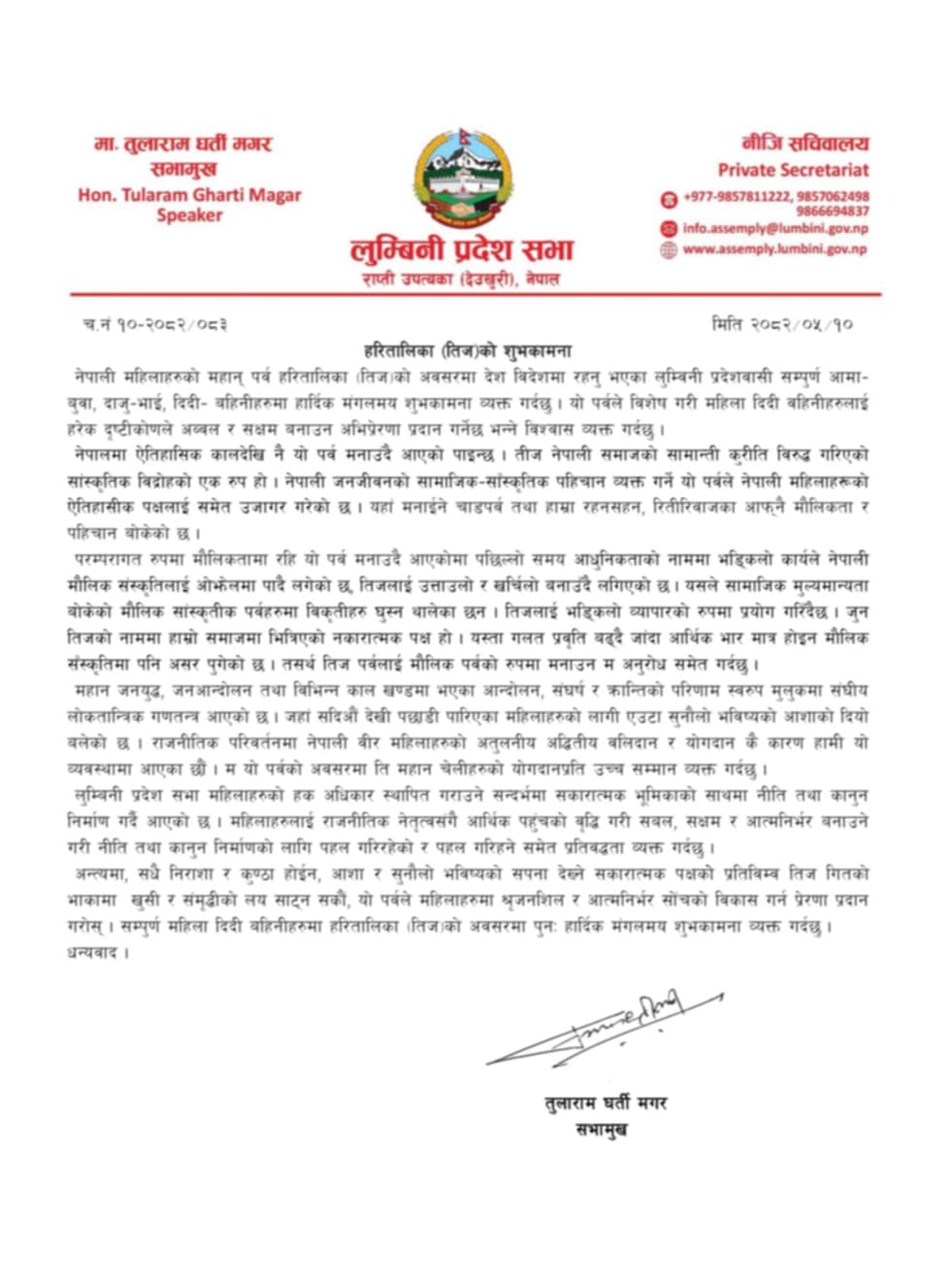 नेपाली महिलाहरुको महान् पर्व हरितालिका (तीज)को अवसरमा आज शुभकामना सन्देश जारी गर्नु हुँदै उनले लुम्बिनी प्रदेश सभाले महिलाहरुलाई आत्मनिर्भर बनाउने नीति तथा कानुनमा प्राथमिकता दिएको र त्यसको लागि पहल गरिहने समेत प्रतिबद्धता व्यक्त गरे । “महिलाहरुको हक अधिकार स्थापित गराउने सन्दर्भमा सकारात्मक भूमिकाको साथमा नीति तथा कानुन निर्माण गर्दै आएको छ । ” शुभकामना सन्देशमा उल्लेख छ-” महिलाहरुलाई राजनीतिक नेतृत्वसंगै आर्थिक पहुंचको वृद्धि गरी सबल, सक्षम र आत्मनिर्भर बनाउने गरी नीति तथा कानुन निर्माणको लागि पहल गरिरहेको र पहल गरिहने समेत प्रतिवद्धता व्यक्त गर्दछु । ”