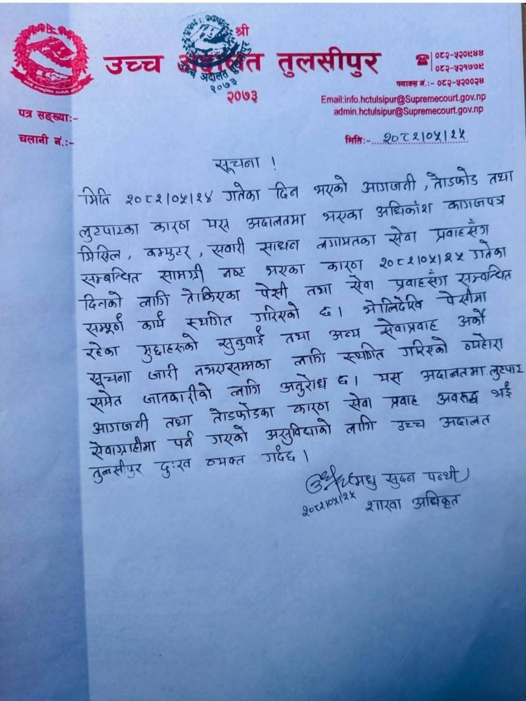 त्यस्तै उच्च अदालत तुलसीपुरका शाखा अधिकृत मधुसुदन पन्थीले पनि मंगलबार भएको आगजनी तोडफोड तथा लुटपाटका कारण अदालतमा भएका अधिकाशं कागजपत्र, मिसिल, कम्प्युटर, सवारीसाधन लगायतका सेवा प्रवाह सँग सम्बन्धित सामाग्रीहरु नष्ट भएकाले आजको लागि तोकिएका मुद्दाको पेसी तथा सेवा प्रवाह सँग सम्बन्धित सम्पूर्ण कार्य स्थगित गरिएको भोली देखिका पेसी तथा सम्पूर्ण कार्य अर्को सूचना नभए सम्मका लागि स्थगित गरिएको बताएका छन् ।