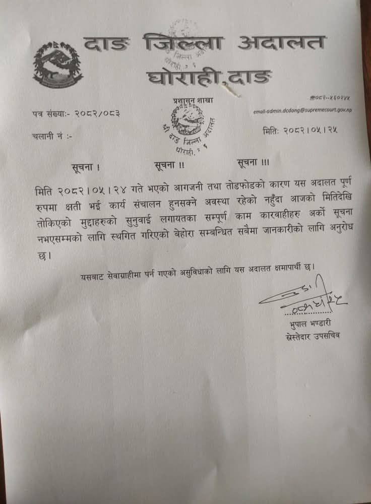 जेनजी युवाको प्रदर्शनका क्रममा मंगलबार ती दुवै अदालत पूर्णरुपमा जलेर ध्वस्त भएको छ । जिल्ला अदालत दाङका श्रेस्तेदार भुपाल भण्डारीबाट आज बिहान जारी सूचनामा लेखिएको छ, ‘मंगलबार भएको तोडफोड तथा आगजनीका क्रममा पूर्ण रुपमा क्षती भई कार्य सञ्चालन हुन नसक्ने भएकोले आज देखि आर्को सुचना नभए सम्मका लागि मुद्दाहरुको सुनुवाइ तथा सम्पूर्ण कार्यहरुस्थगित गरिएको छ ।