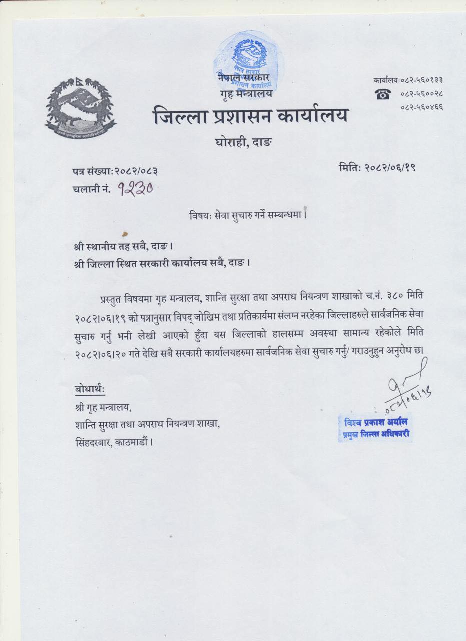 दाङ १९ असोज । जिल्ला प्रशासन कार्यालय दाङले जिल्लामा विपतको जोखिम नरहेकाले भोली सोमबार देखि सम्पूर्ण कार्यालय खुला गर्न आग्रह गरेको छ ।