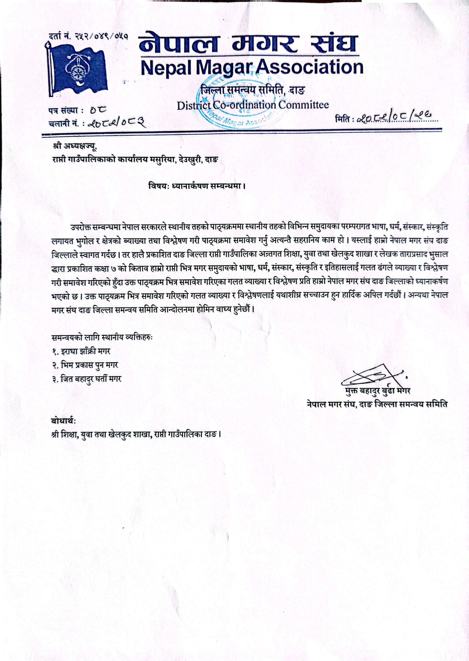 भालुवाङ २७ मंसिर । नेपाल मगर संघ दाङ जिल्ला समन्वय समितिले राप्ती गाउँपालिकाले कक्षा ७ का विद्यार्थीका लागि प्रकाशित गरेको ‘हाम्रो राप्ती’ नामक स्थानीय पुस्तकमा मगर समुदायको भाषा, धर्म, संस्कार, संस्कृति र इतिहाससम्बन्धी तथ्यहरू गलत र विकृत रूपमा प्रस्तुत गरिएको भन्दै औपचारिक रूपमा ध्यानाकर्षण गराएको छ।