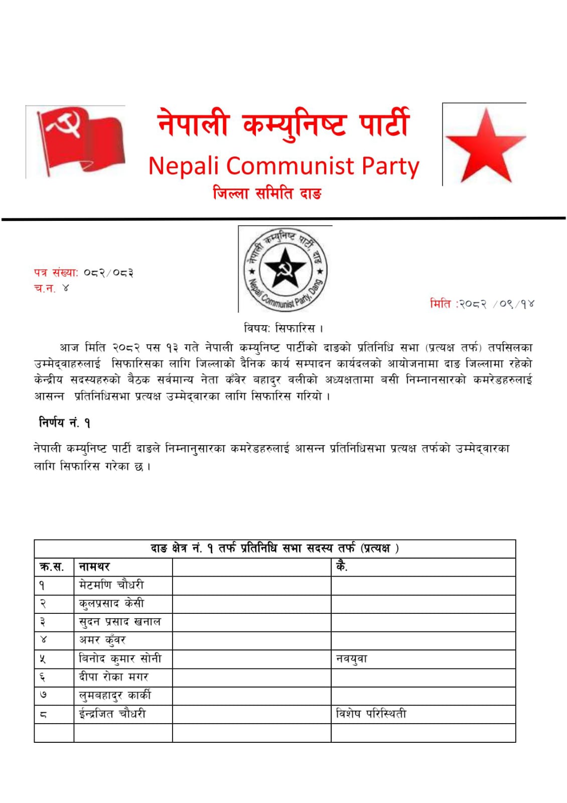 नेकपाद्धारा दाङ क्षेत्र नं. १ मा प्रत्यक्ष तर्फ चौधरीकाे नाम पहिलो नं. र नवयुवाबाट साेनीकाे नाम सिफारिस