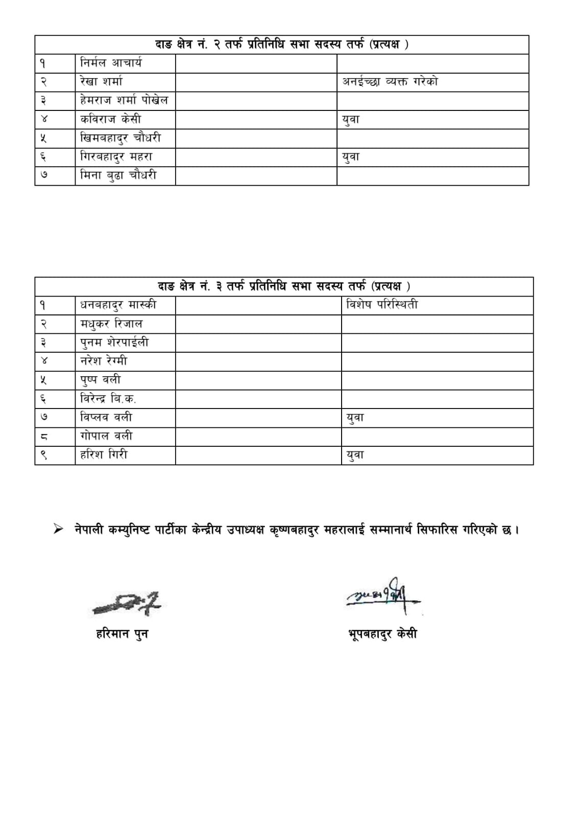 क्षेत्र नम्बर ३ मा प्रदेश सभा सदस्य धनबहादुर मास्की पहिलो नम्बरमा सिफारिस भएका छन् । यसैगरी मधुकर रिजाल, पुनम शेरपाईली, अखिल क्रान्तिकारीका नेता नरेश रेग्मी, वाईसीएल अध्यक्ष पुष्प वली पनि क्षेत्र नम्बर ३ बाट सिफारिसमा परेका छन् । अन्यमा विरेन्द्र विक, विप्लव वली, गोपाल वली, हरिश गिरी पनि सिफारिस भएका छन् । पूर्वसभामुख कृष्णबहादुर महरालाई जिल्लाबाट सम्मानार्थ सिफारिस गरिएको छ ।