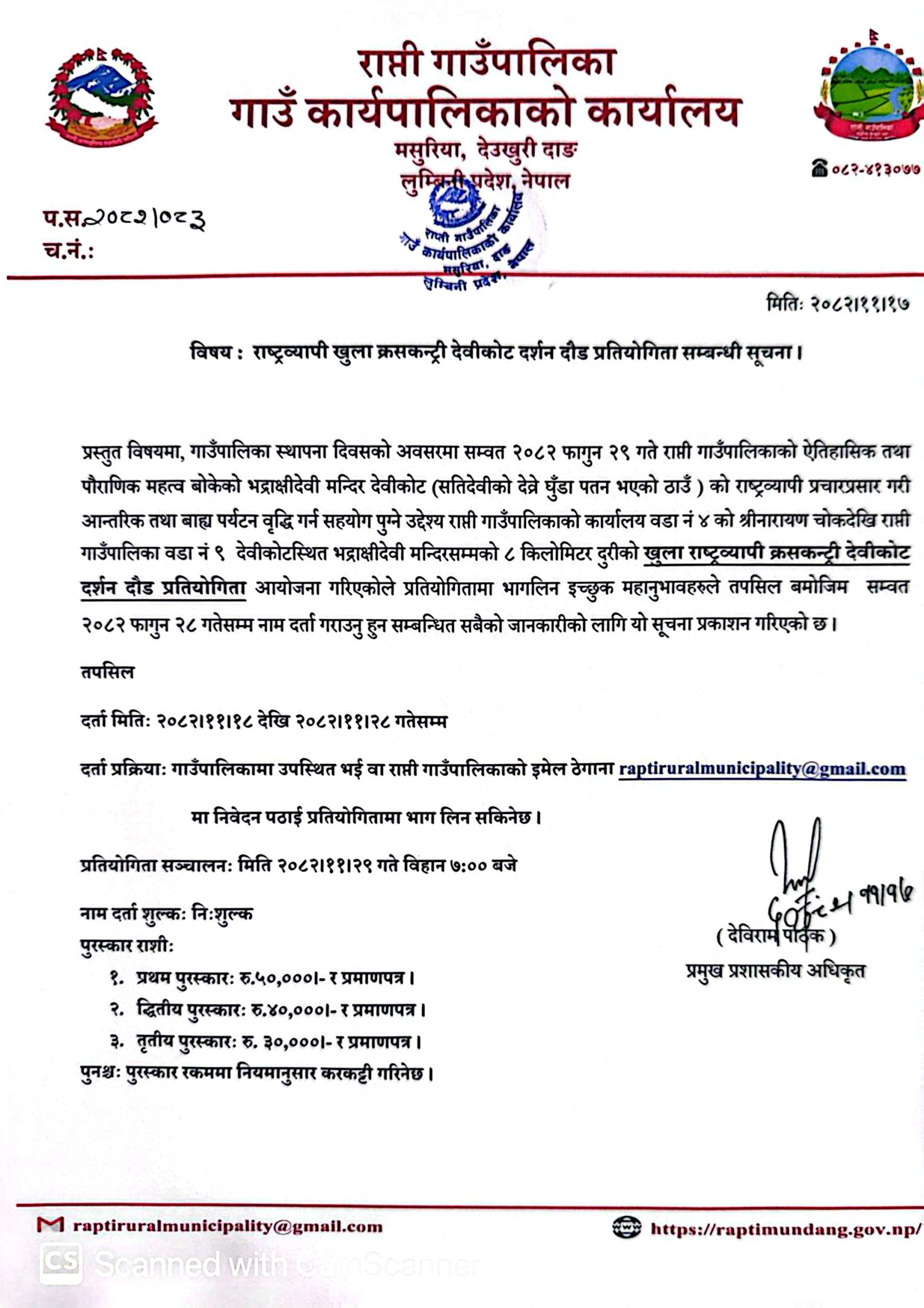 भालुवाङ १८ फागुन । दाङको राप्ती गाउँपालिकाले स्थापना दिवसको अवसरमा राष्ट्रव्यापी खुला ‘क्रसकन्ट्री देवीकोट दर्शन दौड’ प्रतियोगिता आयोजना गर्ने भएको छ।