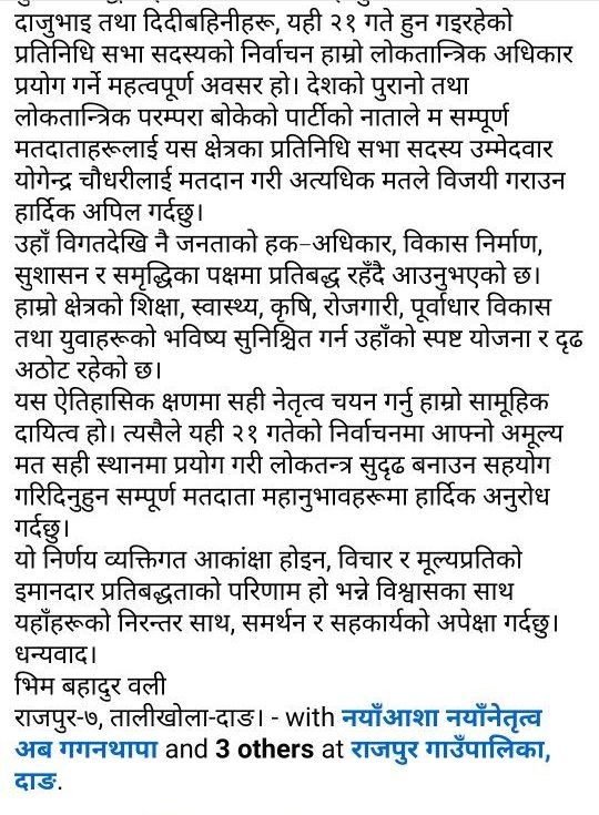 देउखुरी १८ फागुन । नेपाली कम्युनिष्ट पार्टीका जिल्ला कमिटि सदस्य तथा राजपुर गाउँपालिकाका तत्कालीन माओवादीका युवा नेता भीम ओलीले नेपाली कांग्रेस दाङ क्षेत्र नम्बर १ का उम्मेदवार योगेन्द्र चौधरीको पक्षमा मतदान गर्न आह्वान गरेका छन् ।