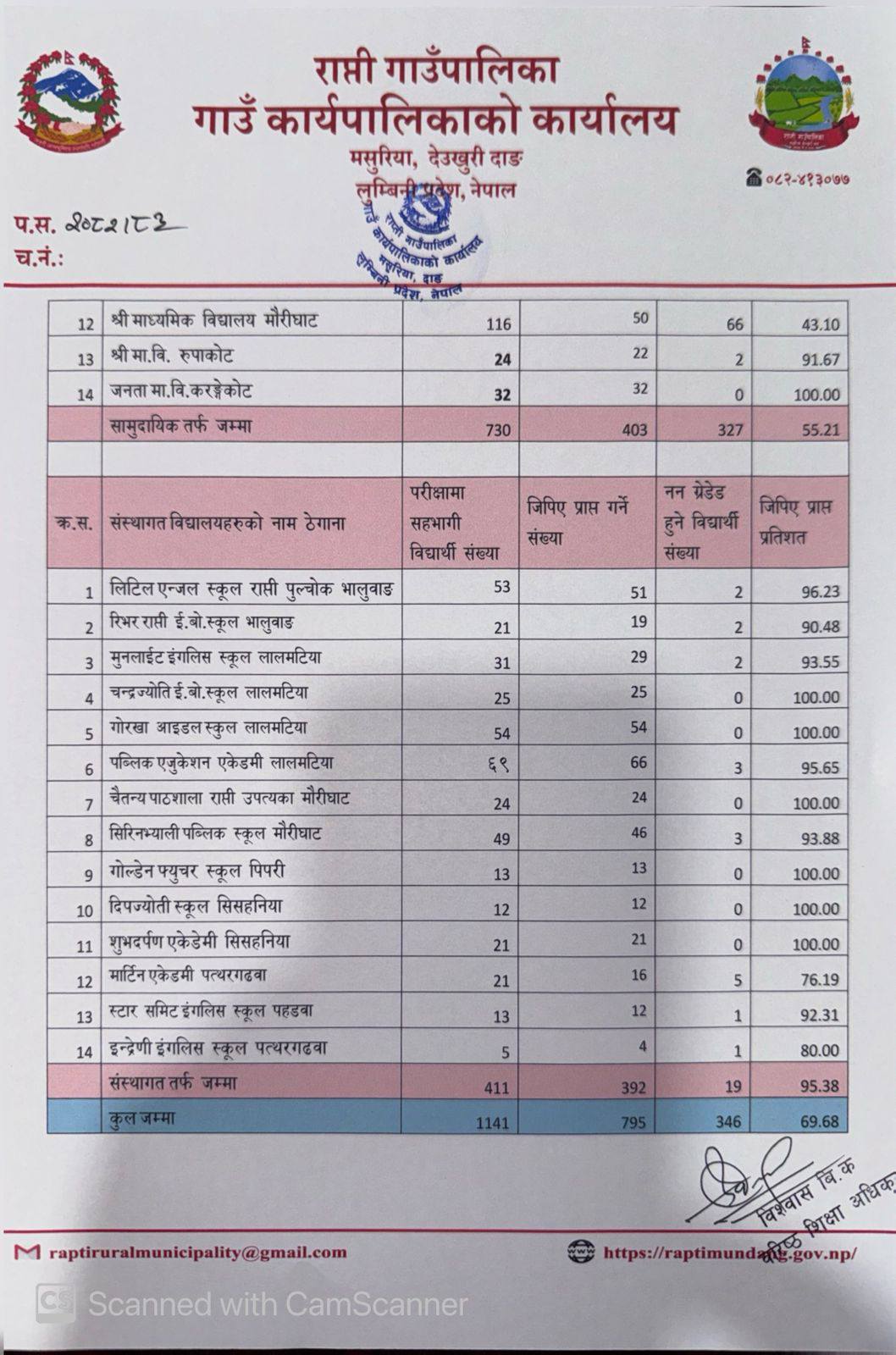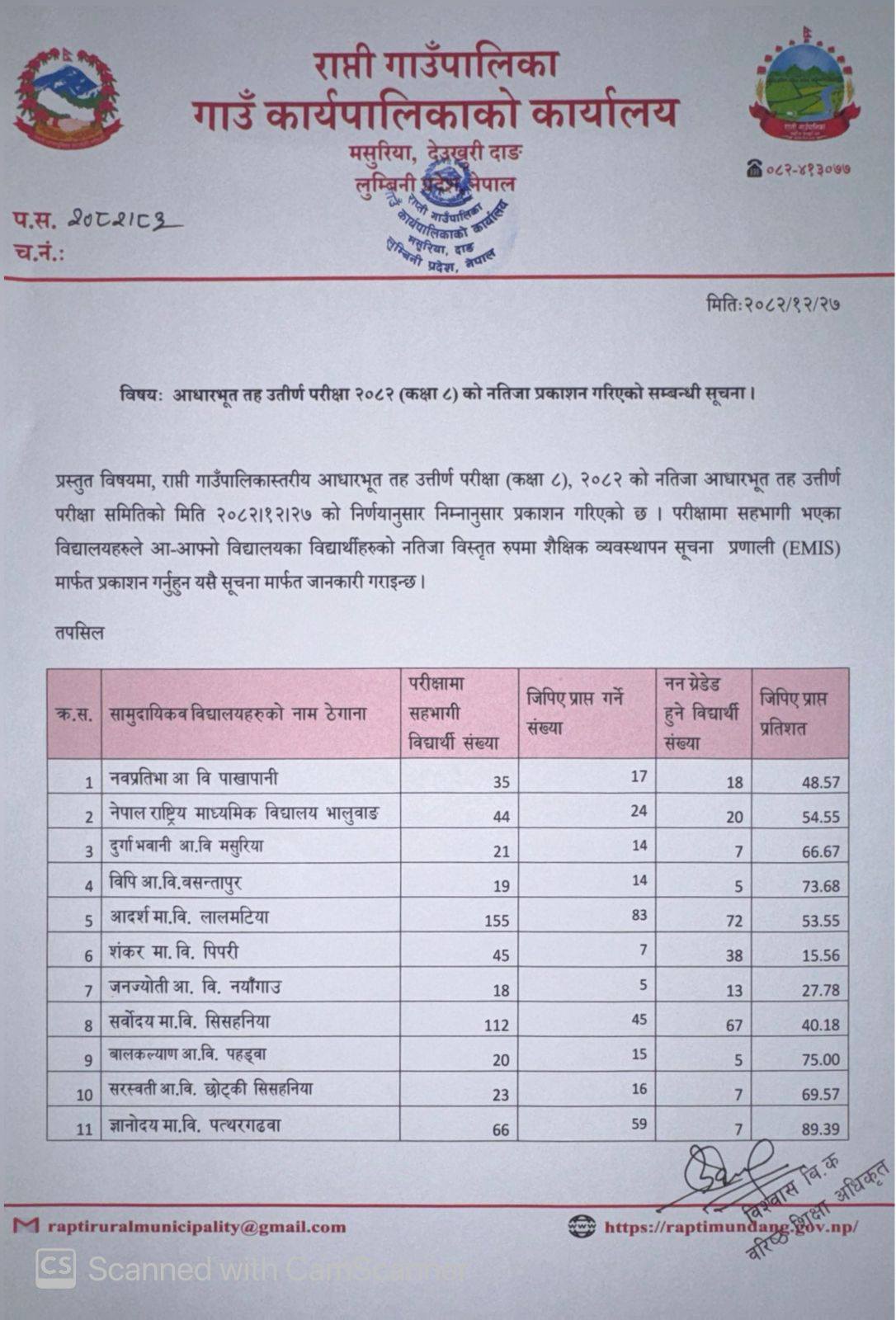 राप्ती गाउँपालिका शिक्षा विकास शाखाले चैत २७ गते शुक्रवार सार्वजनिक गरेको नतिजामा सामुदायिक विद्यालयहरु निकै कमजोर देखाएका छन् । यद्यपी गत वर्षहरुको तुलनामा भने केहि सुधार भएको देखिन्छ । संस्थागत तर्फ शत प्रतिशत नतिजा ल्याउन सफल हुने विद्यालयहरुमा चन्द्रज्योति इङलिस बोडिङ स्कुल लालमटिया, गोरखा आइडियल स्कुल लालमटिया, चैतन्य पाठशाला राप्ती उपत्यका मौरीघाट, गोल्डेन फ्युचर इङलिस बोडिङ स्कुल बिजौरी, दिपज्योति सेकेण्डरी स्कुल सिसहनियाँ र शुभदपर्ण एकेडेमी बड्का सिसहनियाँ रहेका छन् । भने सामुदायिक विद्यालय तर्फ राप्ती गाउँपालिका–५ करङ्गेकोटमा रहेको जनता माध्यमिक विद्यालयले मात्र शत प्रतिशत नतिजा ल्याएको छ । दुवै तर्फका विद्यालय मध्ये सवै भन्दा कमजोर नतिजा राप्ती गाउँपालिका–८ पिपरीमा रहेको शंकर माध्यमिक विद्यालय रहेको छ । जसमा परिक्षामा सहभागी ४५ जना विद्यार्थीमा ७ जना मात्र उत्र्तीण भएका छन् । जसले १५.५६ प्रतिशत मात्र नतिजा ल्याएको छ ।