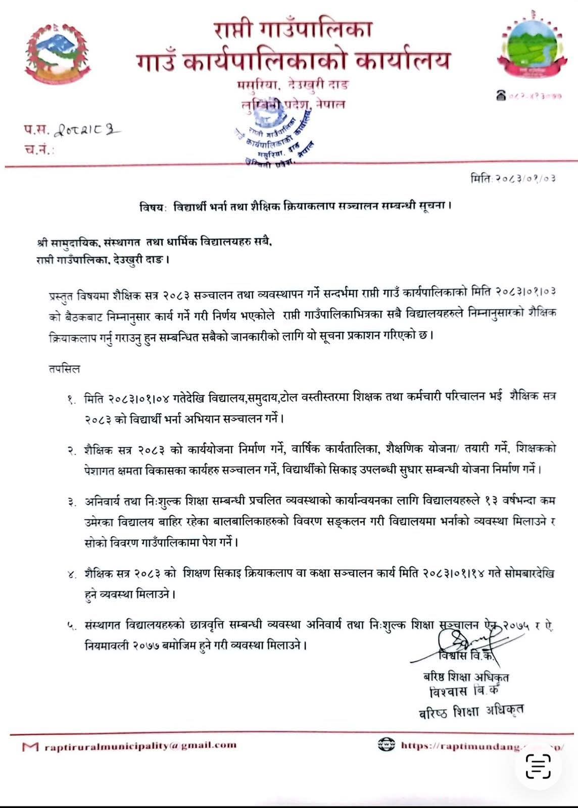 दाङ ३ वैशाख । दाङको राप्ती गाउँपालिकामा शैक्षिक सत्र २०८३ का लागि सामुदायिक, संस्थागत तथा धार्मिक विद्यालयहरूमा विद्यार्थी भर्ना अभियान २०८३ वैशाख ४ गते देखि सुरू हुन लागेको छ । राप्ती गाउँपालिका गाउँ कार्यपालिकाको कार्यालय, मसुरियाले सुचना प्रकाशित गर्दै सामुदायिक, संस्थागत तथा धार्मिक विद्यालयहरूलाई आवश्यक तयारीका साथ शैक्षिक गतिविधि अघि बढाउन आग्रह गरेको हो।