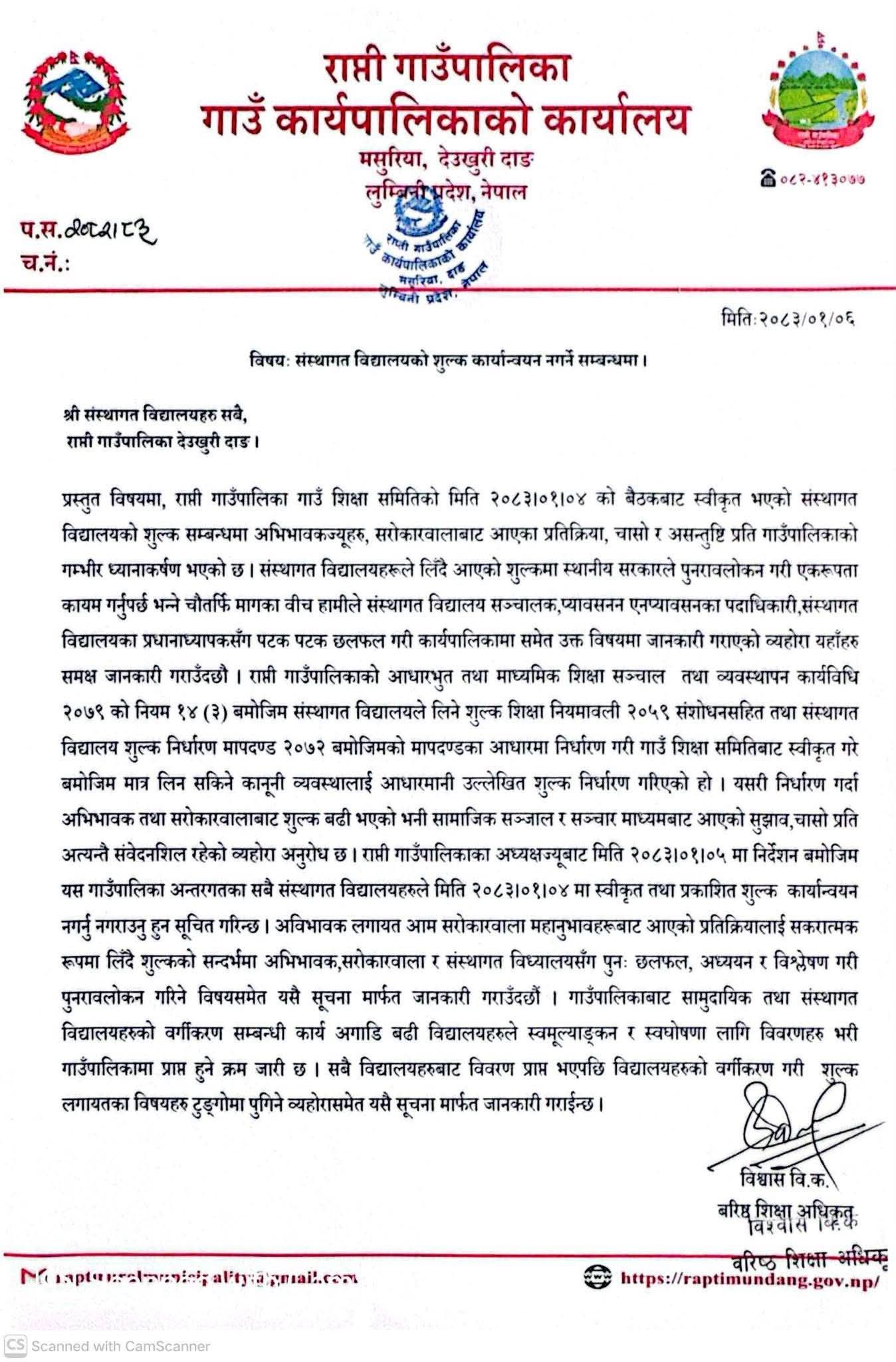 अभिभावको ढाड सेक्ने गरी गत वैशाख ४ गते राप्ती गाउँपालिकाले प्रकाशित गरेको सुचना अनुसार भर्ना शुल्क देखि मासिक शुल्क निर्धारण गरेपछि त्यसको व्यापक रुपमा विरोध भइरहेको थियो । देउखुरी टुडे लगायतका सञ्चार माध्यमको निरन्तर खवरदारी र अभिभावकहरुको चर्को विरोध पछि गाउँपालिका सो शुल्क कार्यान्वयन गर्नबाट पछि हट्न बाध्य भएको हो । गाउँपालिकाले आइतवार सुचना निकारेर अभिभावक र सरोकारवालाहरुको व्यापक जनगुनासो र विरोध पछि गम्भीर चासो व्यक्त गर्दै गाउँपालिकाका अध्यक्ष प्रकाश विष्टको निर्देशनमा गाउँपालिका अन्तरगतका सम्पूर्ण संस्थागत विद्यालयहरुलाई वैशाख ४ गते स्वीकृत तथा प्रकाशित शुल्क कार्यान्वयन नगर्नु नगराउनु निर्देशन दिइएको छ ।