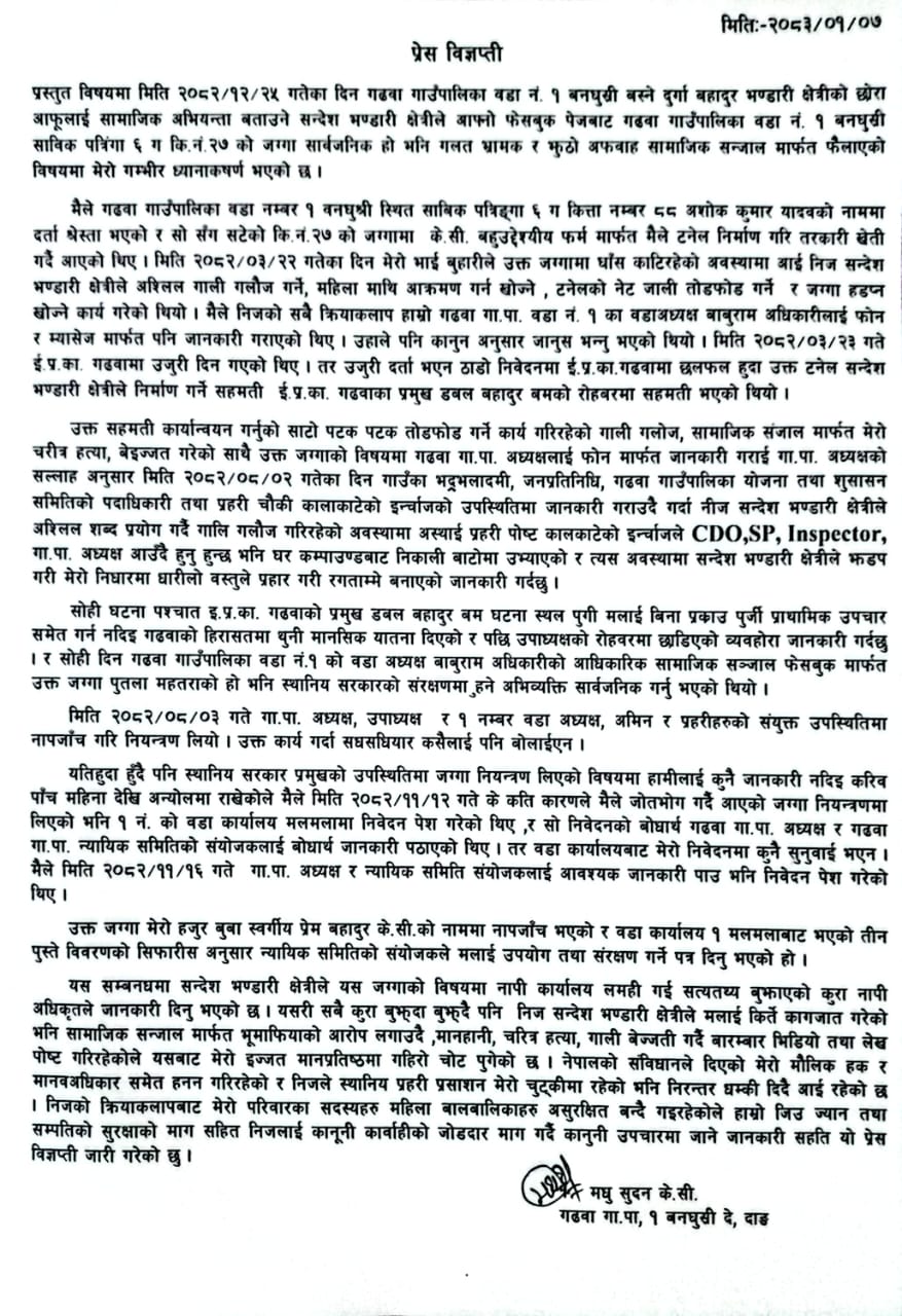 केसीले सोमबार लमहीमा पत्रकार सम्मेलन गरेर गढवा गाउँपालिका–१ बनघुस्री बस्ने आफूलाई सामाजिक अभियन्ता बताउने सन्देश भण्डारी क्षेत्रीले आफ्नो फेसबुक पेजबाट गलत सूचना फैलाएको, चरित्र हत्या गरेको तथा शारीरिक आक्रमण समेत गरेको बताएका छन् । २०८२ चैत २५ गते सन्देश भण्डारी क्षेत्रीले आफ्नो फेसबुक पेजमार्फत साविक पत्रिंगा–६ ग कि.नं. २७ को जग्गा सार्वजनिक भएको भनी भ्रामक र झुठा सूचना फैलाएको केसीले बताए । उक्त जग्गा निजी स्वामित्वको भएको दाबी गर्दै पीडित केसीले सो कार्यप्रति गम्भीर आपत्ति जनाएका छन् ।
