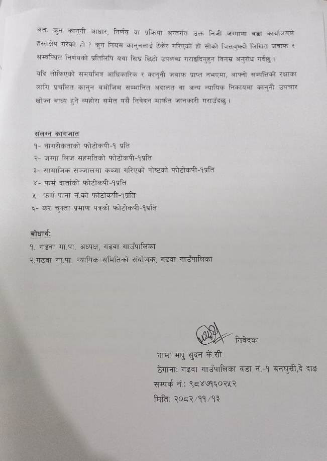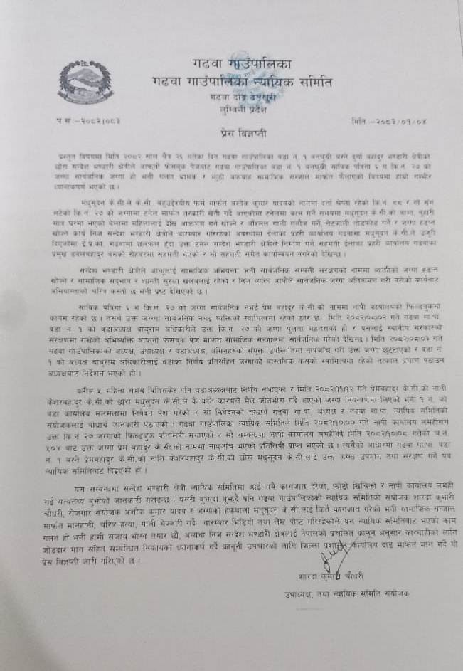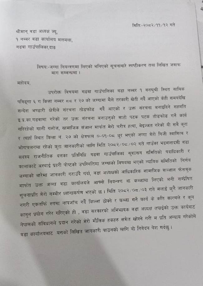 देउखुरी ७ वैशाख । दाङको गढवा गाउँपालिका–१ बनघुस्री निवासी मधुसुदन केसीले श्रेस्ता कायम जग्गालाई सार्वजनिक जग्गा भनी भ्रम फैलाएको प्रति आफ्नो गम्भीर ध्यानाकर्षण भएको बताएका छन् ।