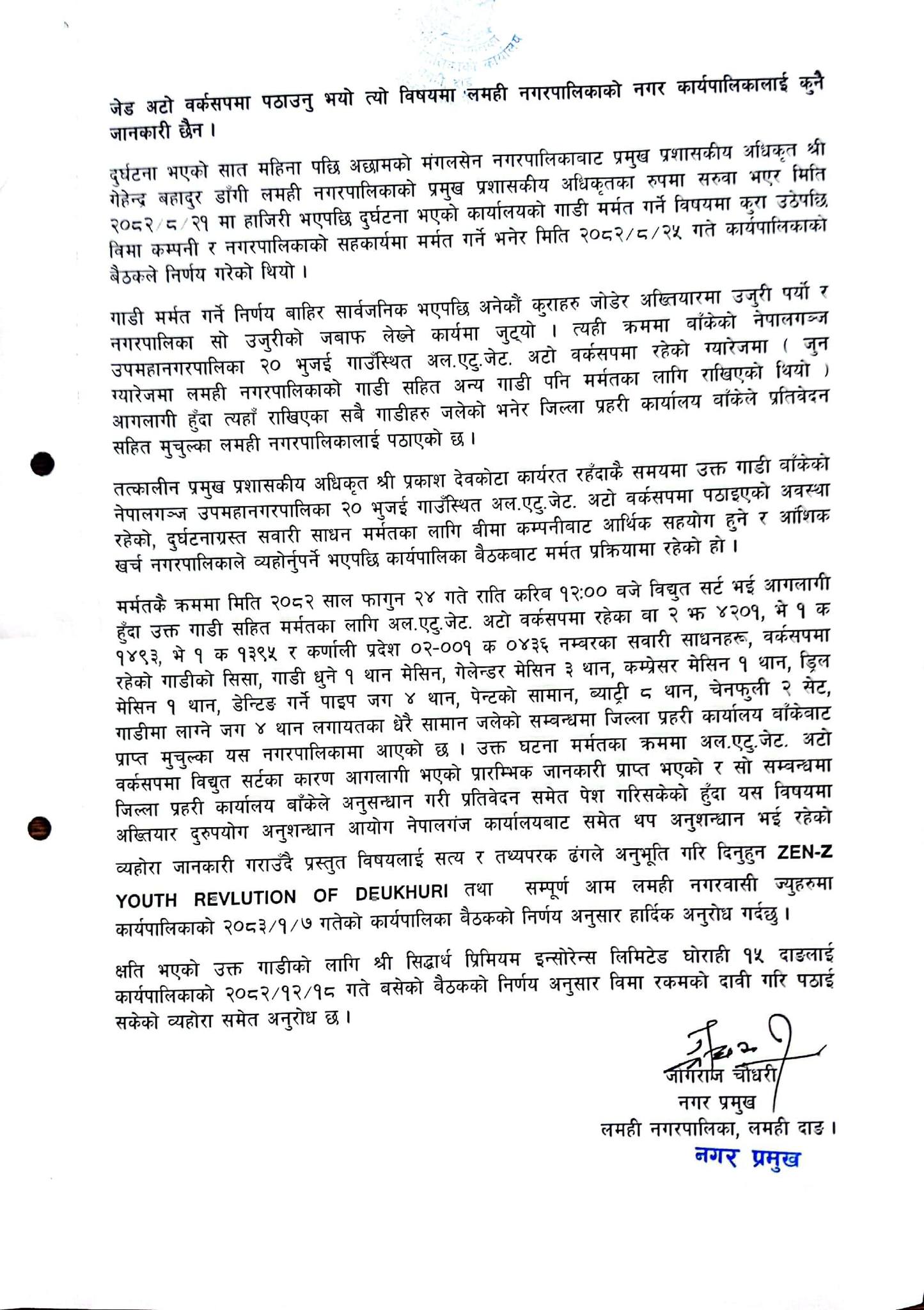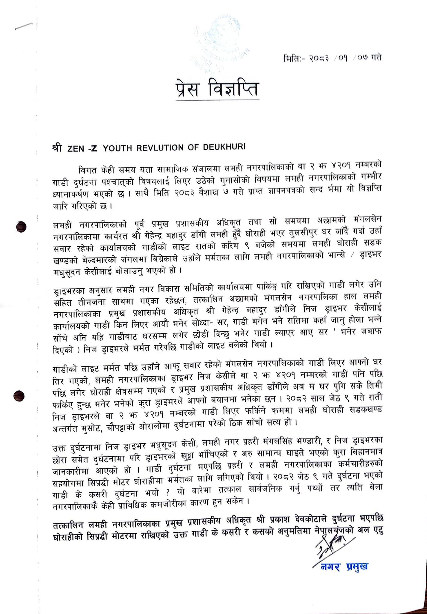 देउखुरी ७ वैशाख । लमही नगरपालिकाको बा २ झ ४२०१ नम्बरको गाडी दुर्घटनापछि उठेको विवाद र सार्वजनिक चासोका बीच नगरपालिकाले विस्तृत प्रेस विज्ञप्ति जारी गर्दै घटनाबारे आफ्नो धारणा सार्वजनिक गरेको छ । नगरपालिकाले केही समयदेखि सामाजिक सञ्जाल तथा स्थानीय स्तरमा उठिरहेका गुनासो र वैशाख ७ गते प्राप्त ज्ञापनपत्रलाई ध्यानमा राख्दै कार्यपालिका बैठकको निर्णयअनुसार विज्ञप्ति जारी गरेको हो ।